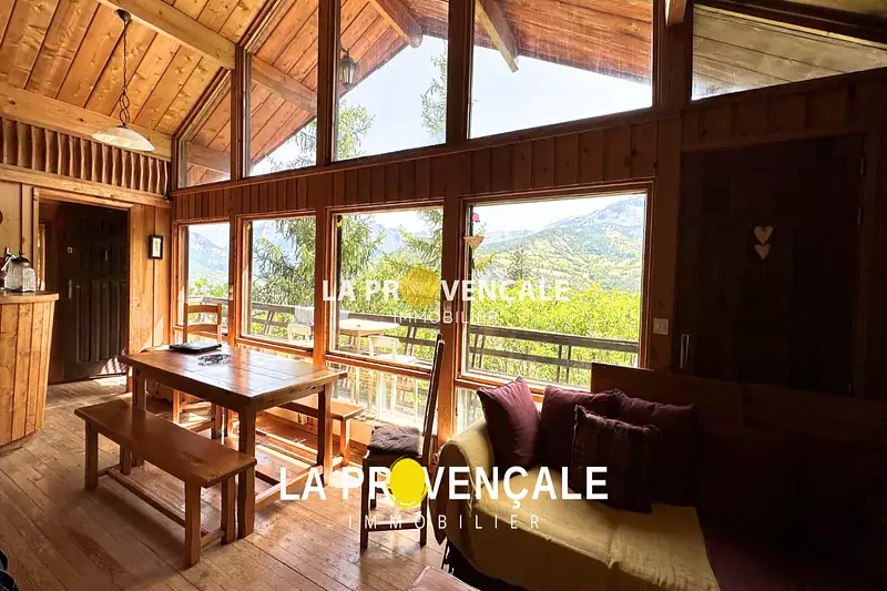 Magnifique chalet individualisé d'environ 140 m² habitables vous attend dans le paisible village d'Enchastrayes (04400). Construit en 1990, cette demeure de charme est en très bon état. Implantée sur un terrain d'environ 800 m², elle offre une belle exposition Sud-Est et bénéficie d'une vue dégagée, constitué de 4 chambres, plus une salle de jeu, une cuisine américaine, une salle de bain, une salle de douche, 2 toilettes et un grand séjour avec cheminée + mezzanine, plafond cathédrale avec très belle vue dégagée sur la Vallée. Vous apprécierez également sa terrasse pour profiter des belles journées ensoleillées. L'habitation est dotée d'un chauffage et d'une production d'eau chaude électriques. Son assainissement est raccordé au tout-à-l'égout. Le calme du lieu ne pourra que vous séduire.