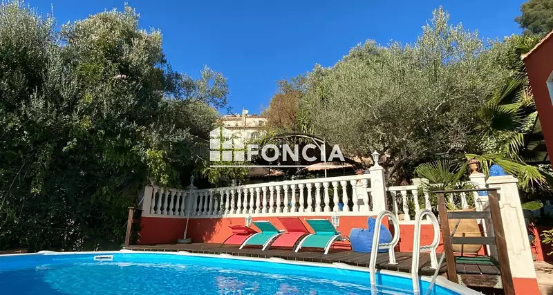 Un jardin de 600m2 fait le tour de la maison et dispose de belles terrasses avec une piscine hors sol intégrée et un pool house avec cuisine d'été.