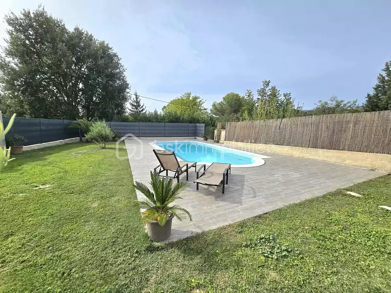 À l'extérieur, le jardin paysager et clos invite à la détente. Une piscine chauffée de 8 x 4 mètres s'intègre parfaitement à cet écrin de verdure, offrant un espace de bien-être et de convivialité face aux collines du Luberon.