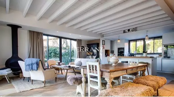 La villa s’ouvre sur une entrée élégante avec placard, menant à un séjour spacieux traversant et baigné de lumière, avec une cheminée qui apporte une touche de raffinement. La cuisine, entièrement ouverte et équipée, se complète d’un cellier. Un palier dessert deux chambres, dont un dortoir raffiné pouvant accueillir jusqu’à quatre couchages, ainsi qu’une salle d’eau contemporaine et des toilettes séparées avec lave-mains. À l’étage, la suite parentale, véritable écrin de sérénité, bénéficie d’une grande terrasse privative. Elle dispose d’une salle de bains somptueuse avec double vasque, douche à l’italienne, baignoire et toilettes séparées, pour un confort absolu et une sensation de bien-être incomparable.