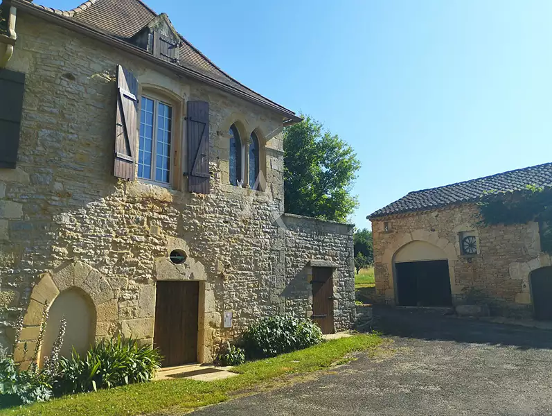 Située à 10 minutes de Prayssac et ses commerces, dans un joli hameau où la pierre du Quercy domine, trouvez cet ensemble immobilier pour divers projets de famille ou locatif. Datée de 1756, rénovée dans les années 90, la première habitation se compose d'un spacieux et authentique séjour/cuisine (47m²) où les poutres, les vitraux et les plafonds hauts donnent un charme d'antan à l'espace. Une lumineuse chambre de 11m², une salle d'eau/wc et un bureau (8,76m²) complètent ce niveau. A l'étage, un grenier pourrait accueillir des chambres supplémentaires. La cave voûtée de 42m² est saine et ventilée. La maison d'amis actuellement indépendante pourrait être connectée à la première comme jadis. Aujourd'hui, elle présente en rez-de-chaussée, un séjour/cuisine (36m²) et à l'étage, 2 chambres (10 et 11m²), salle d'eau, wc et placards. La propriété dispose également de 2 belles granges, un ancien four à pain et un puit. Eléments techniques: chauffage fioul, électrique et bois / double et simple vitrages / toitures datant de +-10ans en très bon état / fosse septique non conforme. Parcelles 9219m² dont 8000m² en prairies planes. Amoureux de le pierre, du calme, du Lot, cet endroit est pour vous!