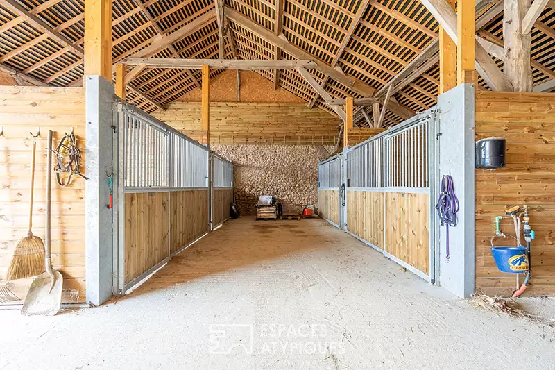 Nichée au coeur de la campagne tourangelle, à seulement 20 minutes de Tours, cette propriété équestre s'étend sur près de 12 hectares de prairies et de paddocks aménagés et 1,6ha de bois. Elle abrite une charmante maison d'environ 140 m² au caractère affirmé. Une dépendance, offrant un potentiel habitable de plus de 300m2, avec permis déjà accordé, vient compléter cet ensemble rare au milieu des chevaux. L'habitation principale séduit par son architecture atypique et son agencement fonctionnel. Les espaces de vie lumineux s'ouvrent sur l'extérieur, offrant une connexion directe avec la nature environnante et un accès direct à la piscine. Une cuisine, moderne et conviviale, complète le rez-de-chaussée. A l'étage, les deux chambres et une salle d'eau bénéficient d'une atmosphère chaleureuse. Un cadre de vie idéal pour les amoureux du calme et des grands espaces. A l'extérieur, la propriété est un véritable havre pour les passionnés d'équitation. Les installations équestres, récemment rénovées, comprennent des paddocks avec abris, un rond d'Havrincourt, une carrière. Ces équipements sont parfaitement drainés et irrigués. Pour une sécurité optimale, les prairies sont toutes équipées de clôtures "horserail" incassables, assurant l'intégrité du cheval en cas de chocs. Un hangar à foin, un second espace pour véhicules utilitaires et un troisième abritant quatre double-boxes, une barre gynécologique et une douche, tous récemment rénovés, complètent cet équipement de premier choix. Située dans un cadre naturel préservé, cette propriété conjugue tranquillité et proximité avec Tours et ses commodités. Une opportunité rare pour les amateurs de chevaux en quête d'une installation équestre fonctionnelle. CLASSE ÉNERGIE : D / CLASSE CLIMAT : B Montant estimé des dépenses annuelles d'énergie pour un usage standard : entre 2298 euros et 3110 euros, indexées aux années 2021, 2022, 2023 (abonnement compris). Contact : (EI) Nicolas DELAIZIR 06 74 47 13 68 Agent Commercial immatriculé au RSAC de Tours sous le numéro 2023AC00133. Les honoraires sont à la charge du vendeur. Les informations sur les risques auxquels ce bien est exposé sont disponibles sur le site Géorisques pour les zones concernées : www.georisques.gouv.fr