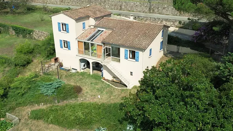 Votre agence ORPI vous invite à venir découvrir cette maison bénéficiant d'une vue à couper le souffle. Composée d'une entrée couverte idéale par temps de pluie, d'un grand salon avec coin repas et une cuisine indépendante donnant sur une terrasse couverte fermée et isolée, un dégagement, un bureau, une chambre et une salle de bains. A l'étage vous trouverez une mezzanine ainsi que deux chambres avec salle d'eau. L'ensemble en très bon état général avec cheminée insert, plancher chauffant basse température avec pompe à chaleur de 2023 et des convecteurs soufflants dans deux chambres ( climatisation par inversion du mode fonctionnement de la pompe à chaleur ) ; Au rdc inférieur : une buanderie, un atelier, une cave et un espace ouvert aménageable, abri voiture, bassin.