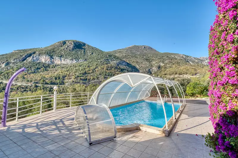 Roquebrune Cap Martin, secteur Coupière, exposée sud-ouest, vue panoramique Monaco, mer et montagne, lumineuse villa de 140 m2 édifiée sur terrain arboré de 2 200 m2 environ, oliviers et arbres fruitiers, piscine (couverte également pour en profiter toute l’année), spacieuse terrasse, grand parking goudronné, pour plusieurs véhicules, deux garages séparés, possibilité d’extension de 48 m2.