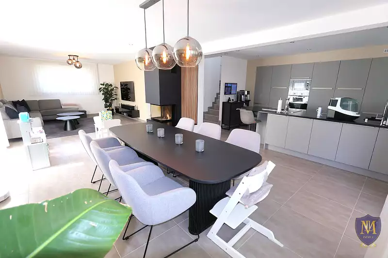 Dans un environnement calme, très belle maison contemporaine année 2018 de 140 m2 habitables, comprenant : une entrée, une cuisine équipée ouverte sur un salon séjour avec cheminée donnant sur une grande terrasse avec pergola, 3 chambres dont une avec dressing et une salle de bains équipée avec baignoire/douche à l'italienne ainsi qu'un emplacement pour machine. Le sous-sol est aménagé d'une chambre, une pièce multifonctions, un local technique et une cave. À l'extérieur un garage et 5 places de parking viennent compléter ce bien. Le tout sur un terrain de 5,20 ares.
