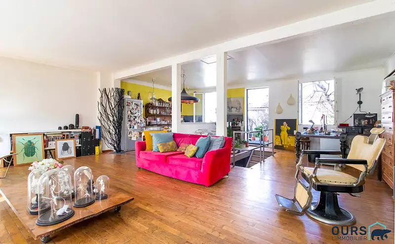 A l'étage, un lumineux plateau aux allures d'ancien atelier en adéquation parfaite avec l'esprit des brocanteurs du Marché aux Puces. Entièrement ouvert et de près de 70 m² répartis en un grand séjour orienté plein Sud d'environ 40 m² avec cheminée, un espace bureau, une cuisine avec salle à manger ouverte sur la terrasse haute, si intime et charmante.
