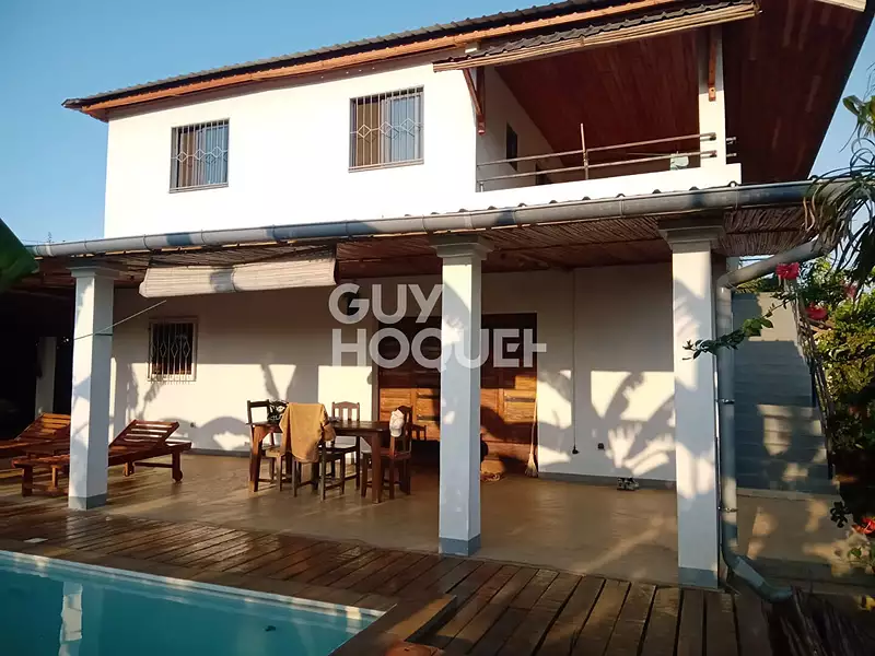Jolie maison à Nosy Be, Madagascar Située dans un quartier en plein essor de Nosy Be, cette belle maison comprend deux logements indépendants, offrant confort et intimité. Le bien se compose comme suit : Rez-de-chaussée : Une spacieuse varangue donnant directement sur la piscine Un séjour lumineux avec cuisine ouverte Une suite parentale Une chambre supplémentaire Une salle d'eau avec WC A l'étage : Un séjour avec cuisine ouverte donnant sur une terrasse Deux belles chambres Une salle d'eau avec WC Accès individuel par un escalier extérieur La maison dispose également de nombreux équipements pratiques : Un abri pour véhicule Un puits Un lavoir Une cave Un grand portail roulant avec un portillon piéton intégré Le bien est raccordé à une fosse septique, à l'alimentation électrique et à l'eau du réseau. Terrain : Le tout est situé sur un terrain plat titré de 414 m², borné et disposant d'un livre foncier. Le bail emphytéotique est de 99 ans. Accès : La maison est facilement accessible depuis la route principale, à seulement 150 mètres de la sortie de Manga Be, en 2ème position. Quartier : Le quartier est en pleine expansion avec un grand projet de développement en cours. Ce projet comprend des commerces, un pôle santé et des habitations résidentielles, et les premiers travaux ont déjà commencé.