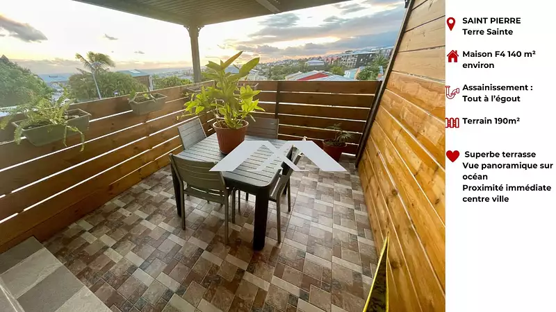 Atout coup de coeur : une grande chambre indépendante de 25 m² avec sa propre salle d'eau et une terrasse exceptionnelle offrant une vue panoramique sur l'océan et la ville de St Pierre. Equipement de qualité : 2 chauffe-eaux solaires, climatisation dans toutes les pièces, tout à l'égout et portail motorisé.
