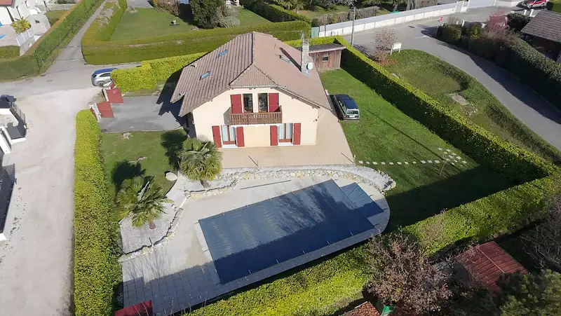 D'une surface de 140 m² dont 124 m² habitables, le hall d'entrée dessert le garage isolé de 19m², des WC, une buanderie ainsi que l'espace à vivre de 54 m² avec cuisine ouverte. A l'étage, le dégagement distribue une salle d'eau avec WC, 3 confortables chambres dont 2 avec placards penderies se partagent le balcon au Sud avec une vue sur la piscine, et la chambre parentale de 26 m² avec douche à l'italienne, vasque et WC.