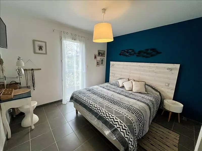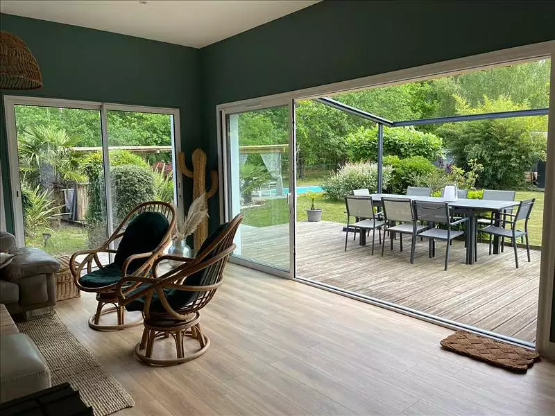 Face à la forêt non constructible, proche des commerces, contemporaine à vendre.Composée d'une spacieuse pièce de vie lumineuse d'environ 70m², cellier, chambre parentale avec salle de bains et wc, 3 autres chambres, salle d'eau et wc. Sur un terrain de plus de 1600m² avec piscine, bar extérieur et pergola.