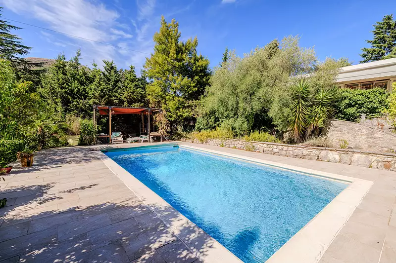 La piscine, idéalement positionnée entre la villa principale et la dépendance, renforce l’autonomie de chaque espace tout en offrant un lieu central de convivialité.