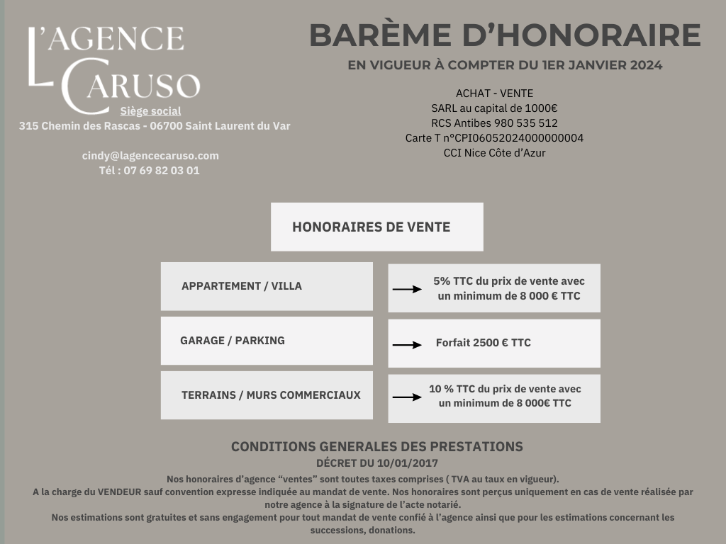 Honoraires à la charge du vendeur. Barème d’honoraires : voir le barème