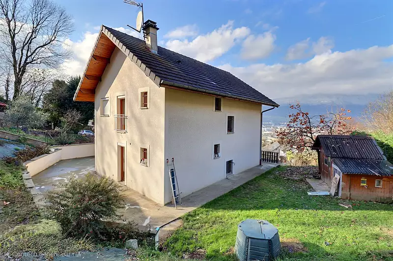 Exclusivité Corner Immo : Chambéry - limite Chambéry-le-Vieux - Maison T6 de 2008 située dans un environnement résidentiel au calme et à proximité des commodités. Idéalement pensée pour sa vocation familiale, cette maison offre 141 m² habitables sur un terrain de 559 m², ainsi qu'une belle terrasse couverte exposée Sud et Ouest d'environ 40 m². Le niveau principal propose un beau volume de vie, comprenant un séjour lumineux d'environ 22 m² ouvert sur l'extérieur, et une cuisine dînatoire de 17 m² avec accès direct à la terrasse. Une chambre de plain-pied, une salle d'eau et un WC complètent ce niveau. L'espace nuit à l'étage se compose de 4 chambres confortables et bien proportionnées de surfaces de 10 à 18 m2, dont deux avec accès sur un beau balcon filant avec vue sur les montagnes. Une salle de bain et un WC complètent ce niveau. Atout majeur du bien : un sous-sol complet avec un grand garage de 40 m². Cet espace est idéal pour stationner plusieurs véhicules, stocker du matériel, ou même envisager un projet d'atelier ou de stockage. Chauffage par chaudière fuel récente, au sol pour le rez-de-chaussée et radiateurs à l'étage, les menuiseries sont en bois double vitrage.