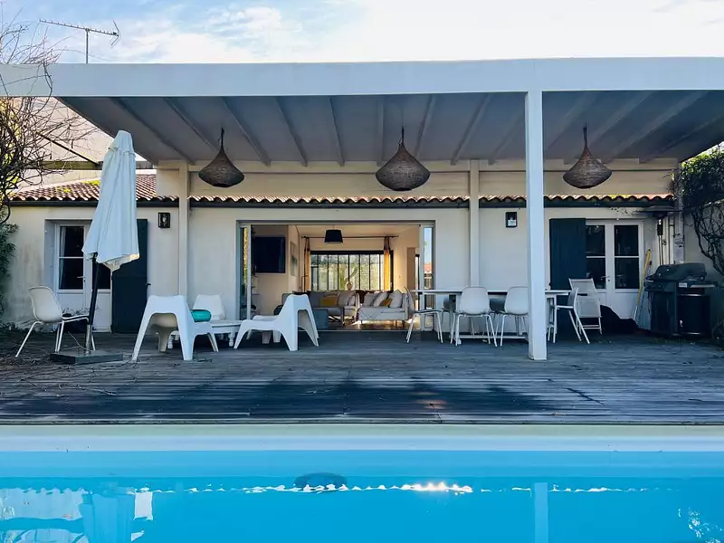Cette maison baignée de lumière vous propose un grand séjour lumineux et une grande cuisine avec beaucoup d 'aménagement et totalement équipée Ces pièces de vie donne sur une grande terrasse bois avec piscine chauffée,(pompe à chaleur neuve),