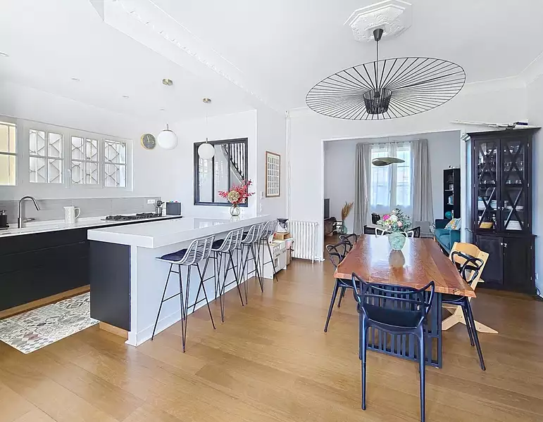 D’une superficie d’environ 140 m², cette propriété rare séduit par ses volumes harmonieux, sa luminosité traversante et la qualité de ses prestations. Elle offre quatre chambres spacieuses, deux salles d’eau subtilement rénovées, ainsi qu’une pièce de vie traversante, baignée de lumière naturelle, sublimée par un insert qui lui confère une atmosphère à la fois chaleureuse et acceuillante.
