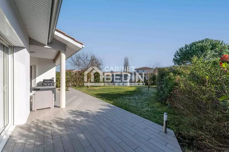 CONTEMPORAINE 140m2 PLAIN PIED BLANQUEFORT. Situé au calme, cette maison de plain pied récente construite en 2013, offre de belles prestations. Parfaitement organisée autour d'une pièce de vie avec cuisine US de plus de 50m2 largement ouverte sur le jardin, lumineuse et fonctionnelle, elle offre également deux chambres et dressing, suite parentale avec pièce d'eau, bureau, garage, grande terrasse.