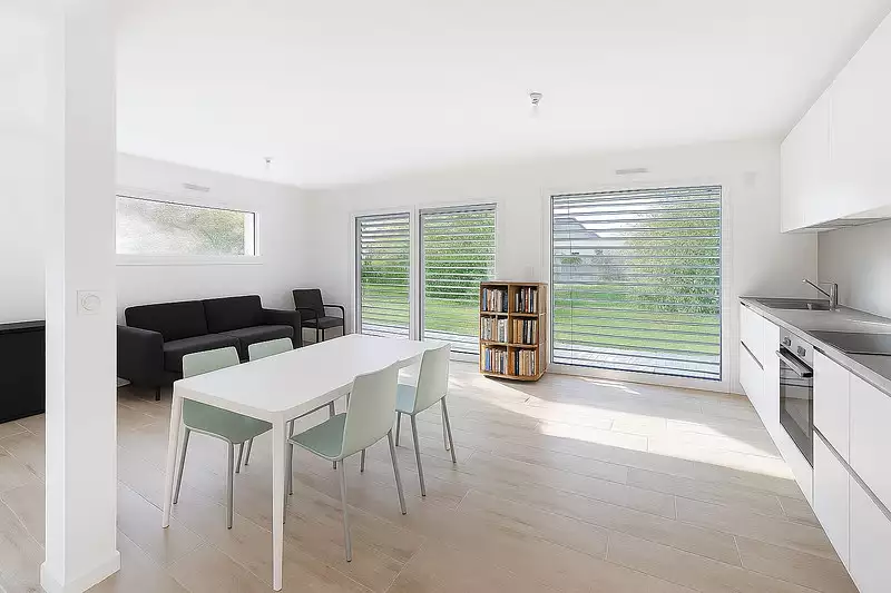 Dès l'entrée, vous serez séduit par la luminosité des pièces. Le rez-de-chaussée propose un vaste espace de vie de 40 m² ouvert sur la terrasse et le jardin, avec un conduit en attente pour un poêle, une chambre, une salle de douche avec WC ainsi qu'une buanderie fonctionnelle.