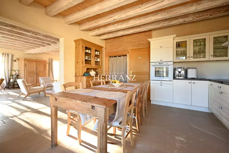 Vous serez séduit par les volumes de la pièce de vie, trés lumineuse,avec de magnifiques poutres apparentes patinées ,ce qui apportent toute la douceur de cette maison .