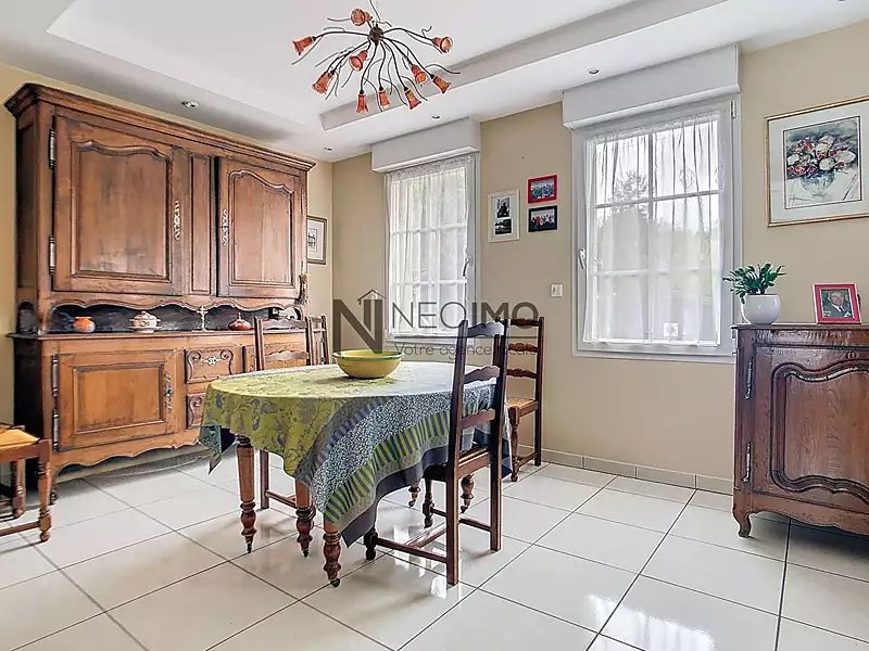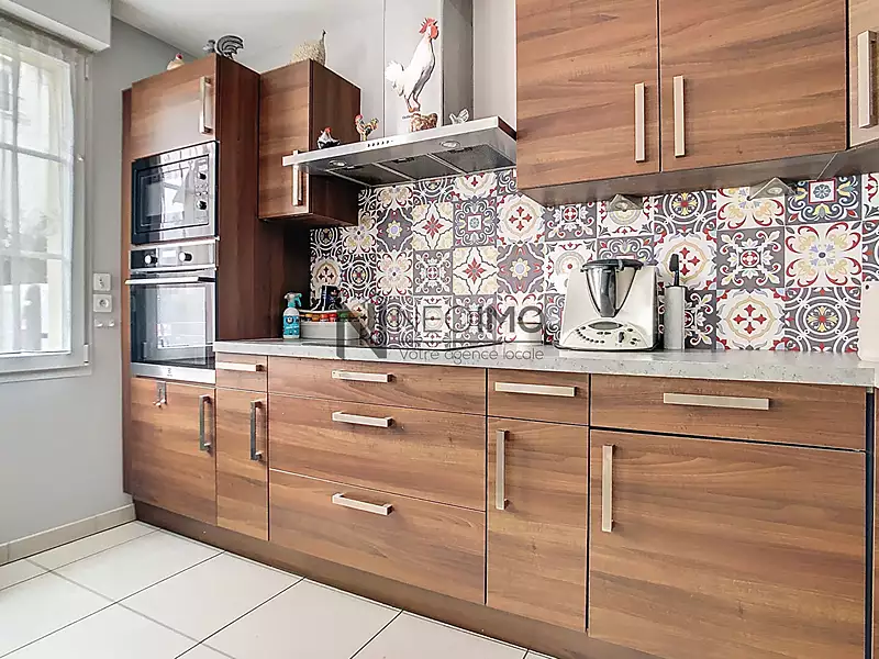 Idéalement située. Proche centre et à proximité des écoles. Maison en excellent état général, 145 m² habitables. - Au rez-de-chaussée : Hall Entrée, très belle cuisine équipée ouverte sur le séjour, salon, salle d'eau avec wc, wc séparés. Garage, buanderie. - Au 1er étage : 4 chambres, salle de bains, wc séparés, pièce de rangement. - Grande terrasse sur l'arrière - Jardin clos avec cabanon - Porche (stationnement couvert) Chauffage central gaz de ville.