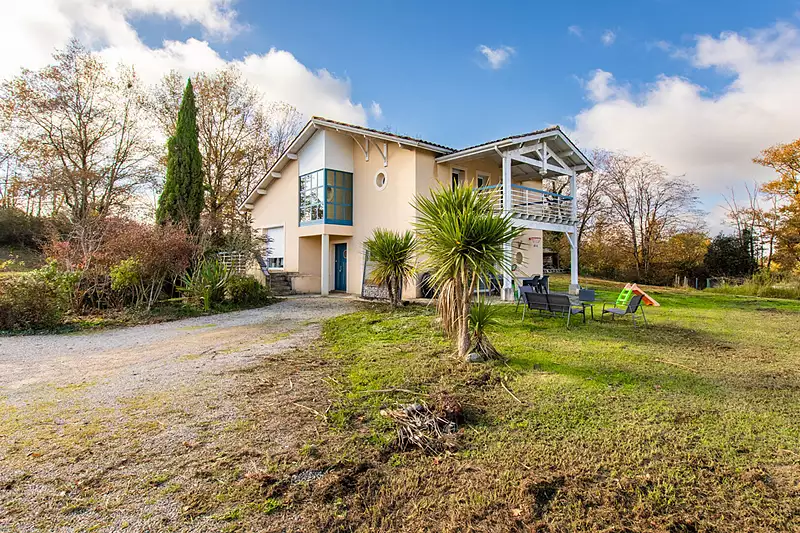 Perchée en hauteur avec une vue dominante et dégagée, cette maison d'architecte ne ressemble à aucune autre ! Ici, on parle d'un vrai coup de coeur pour les familles qui recherchent du caractère, de l'espace et du confort. Dès l'entrée, la lumière s'invite dans chaque pièce : une grande cuisine dinatoire ouverte sur la terrasse, un salon lumineux tourné vers l'extérieur, une suite parentale et deux autres chambres confortables, une salle de bain avec douche et baignoire, et 2 espaces pouvant servir de 4ème chambre, salon lecture, etc... Tout est pensé pour le bien-être du quotidien. Le sous-sol de 55 m² complète parfaitement la maison avec son espace garage et bricolage, idéal pour les familles actives ou les passionnés de projets maison. Côté confort, rien n'a été laissé au hasard : chauffage par géothermie au sol, volets roulants électriques, aspiration centralisée... une alliance réussie entre architecture de caractère et confort moderne. Quelques travaux de rafraîchissement vous permettront d'y apposer votre style et de transformer cette maison atypique en votre futur cocon familial. Une maison unique, baignée de lumière, avec une vue dégagée et une vraie âme : coup de coeur garanti pour ceux qui recherchent autre chose qu'une maison ordinaire. Le tout à 5 minutes en voitures de tous les commerces et commodités, du circuit automobile de Nogaro, des vignobles d'armagnac...