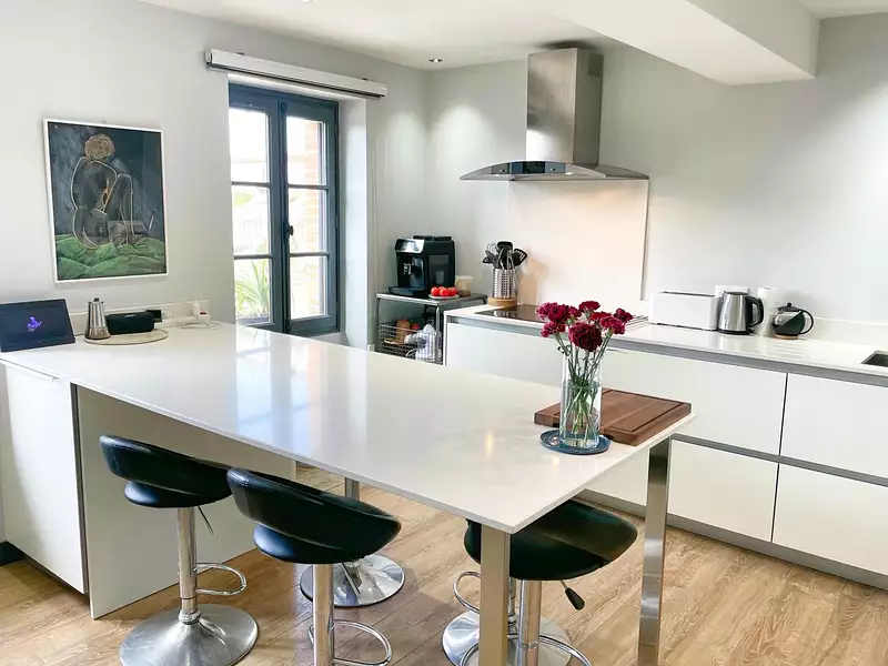 Arrivée dans la cuisine exposée plein sud, entièrement aménagée et équipée et dotée d’une superbe table en quartz blanc qui inonde la pièce de lumière, elle est ouverture sur le salon. Juste à côté, un vaste salon traversant et une cheminée avec insert prête à réchauffer vos soirées d’hiver.