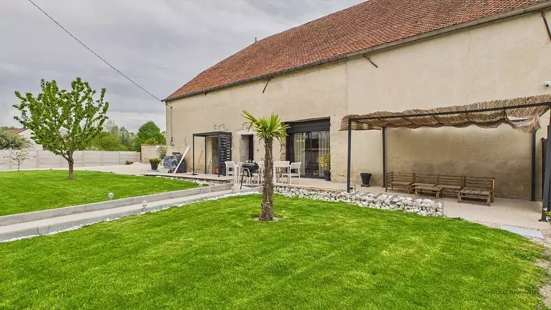 Proche Romilly sur Seine. Maison de plain-pied, rénovée avec goût dans une ancienne grange, comprenant : entrée de 5.17m² avec placards, pièce de vie de 51.24m² carrelée avec cuisine aménagée équipée et baie vitrée, chambre carrelée de 14.18m² avec dressing, chambre carrelée de 20.45m² avec dressing, suite parentale carrelée de 16.58m² avec salle d'eau et dressing, wc carrelé avec lave mains, salle de bains carrelée de 9.82m² (baignoire nomade/douche/wc), cellier buanderie de 8m².