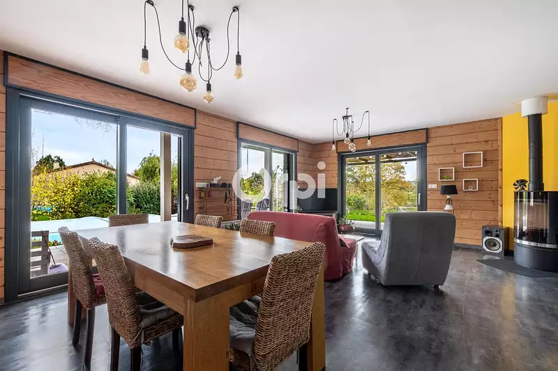 Une vaste pièce de vie baignée de lumière, ouverte sur une cuisine équipée et donnant accès à une superbe terrasse d'environ 60 m² et à la piscine couverte — un vrai lieu de vie à partager en famille ou entre amis.