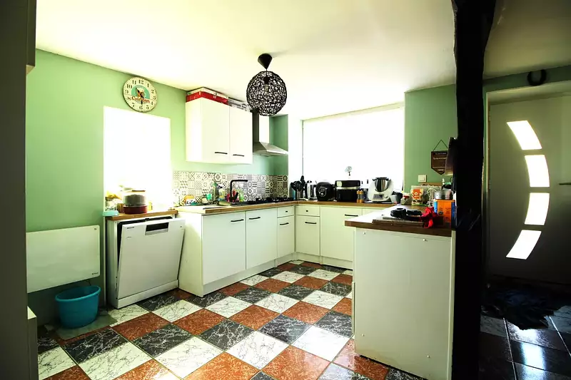 Au rez-de-chaussée, une grande pièce de vie comprenant cuisine, salle à manger, ainsi que les sanitaires et la buanderie.