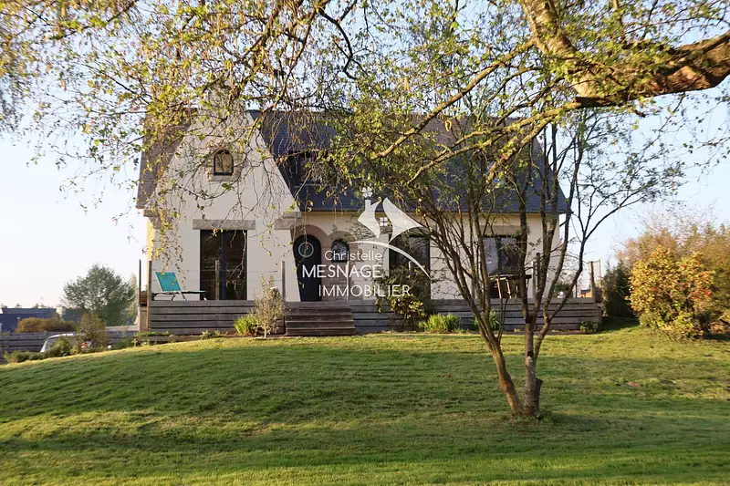 À vendre chez Christelle Mesnage, proche de DINAN, belle maison néo-bretonne sur sous-sol total de 143m² offrant : une cuisine équipée ouverte sur un séjour avec un poêle à granulés et avec un accès au jardin, une salle de bains équipée et un wc, 3 belles chambres dont une au rez-de-chaussée, un bureau, une salle d'eau avec wc, un garage, une buanderie et autre bureau avec un accès sur l'extérieur. Le tout sur un terrain de 3370m² arborés et constructibles. Bonne construction, lumineuse, calme, tous les commerces à pied et les écoles, proximité de la Rance et du halage à pied. Coup Coeur.
