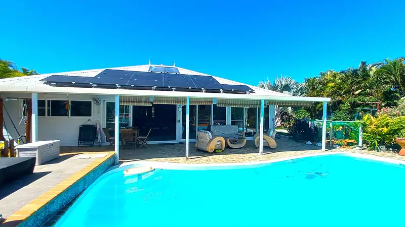 Dans le lotissement de Tiaré Beach, sur un terrain de 15 ares arboré et entièrement clôturé , en bord de canal, Villa F4 comprenant : cuisine équipée ouverte sur séjour, chambre parentale avec salle d'eau et dressing, chambre avec douche, buanderie.