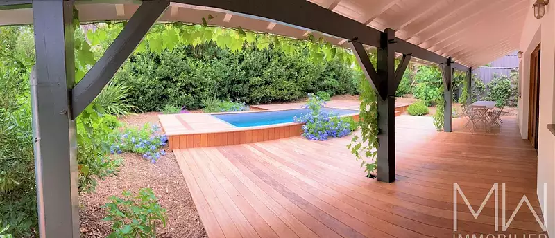 Cette villa est implantée sur une magnifique parcelle paysagée de 780m2 avec piscine chauffée, et grandes terrasses couvertes.