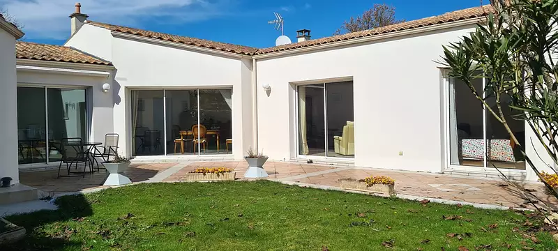 Jolie villa de plain pied comprenant, une entrée, un vestiaire avec wc, un vaste et lumineux salon-séjour avec cheminée insert et une belle hauteur sous plafond de 54 m², une cuisine équipée, deux suites parentales dont une de 40 m² avec une grande salle de bains avec douche et double vasque, possibilité d'une 3ème chambre. Alarme. Cellier. Garage. Cave. Abri voiture. Terrasse exposée sud. Adorable jardin clos sans vis à vis de 440 m².