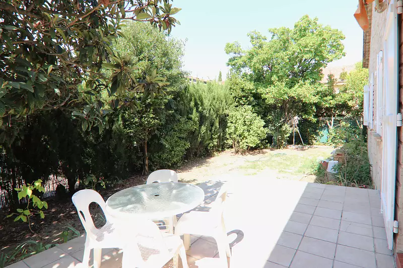 Jardin ensoleillé avec terrasse et possibilité de petite piscine. Super potentiel!