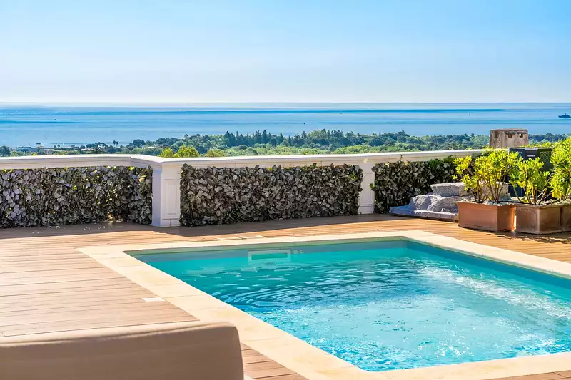 La villa se présente en parfait état avec une terrasse/jardin ensoleillée, une piscine et un jacuzzi, ainsi qu’une vue absolument exceptionnelle sur la Méditerranée.