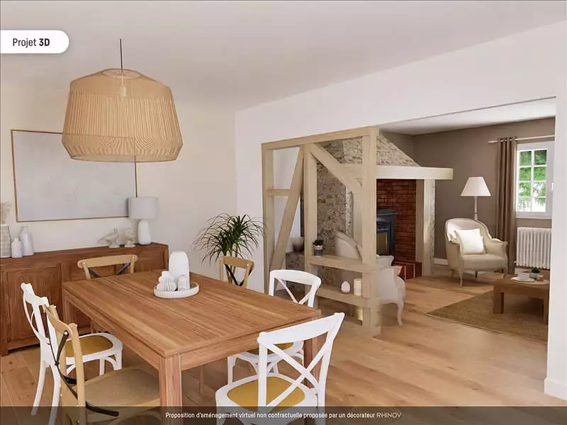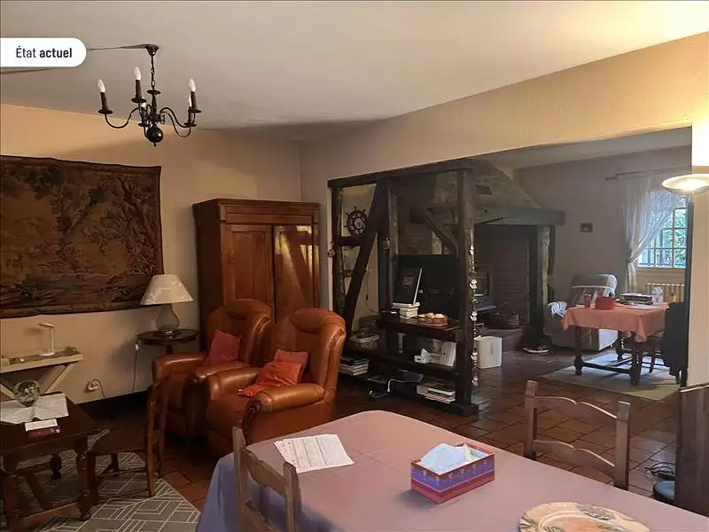 Maison traditionnelle, bâtie sur sous-sol avec garage, composée d'une grande pièce de vie avec cheminée, 5 chambres, tommettes au sol, située en position dominante, sur un terrain d'environ 3 800 m², pas de voisins à proximité, au calme. Proposition d'aménagement virtuel non contractuelle en dernière photo.