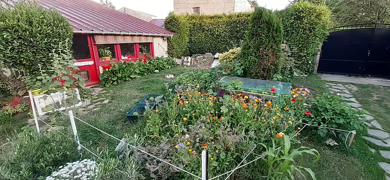 Le jardin dispose d'un potager et d'herbes aromatiques d'environ 25 m² et d'un petit étang.