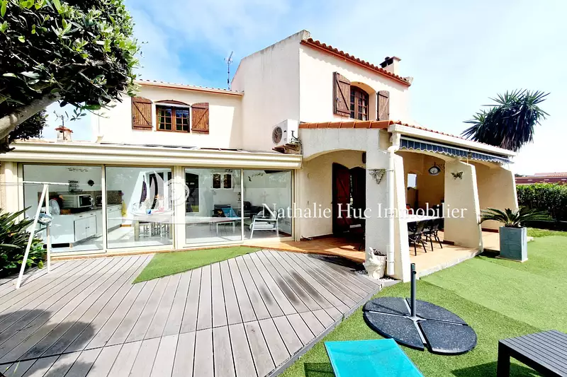 66140 CANET-PLAGE Secteur recherché. VILLA d'architecte, proche plage et commodités, sur un jardin de 422 m² arboré sans vis-à-vis exposée plein sud. Une belle pièce de vie lumineuse, une cuisine indépendante équipée donnant sur une véranda, une chambre, une salle d'eau, une salle de bains, une buanderie et un wc. À l'étage deux chambres, un grand bureau, un dressing et un wc. Un comble aménagé. Un garage et une cave