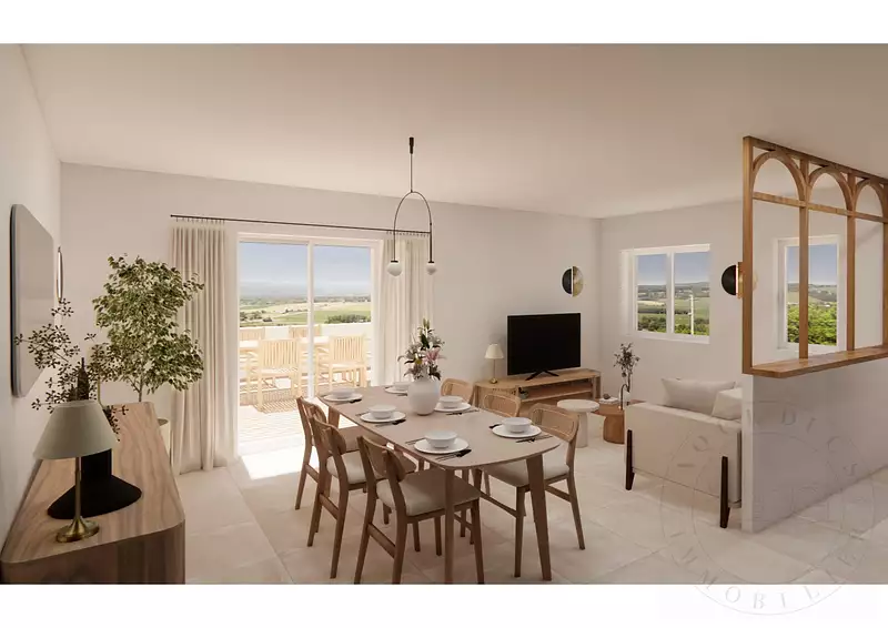 Au premier étage, une belle pièce de vie d'environ 50 m² s'ouvre sur une terrasse de 32 m² exposée plein ouest. L'espace cuisine ouvert sur le séjour est à équiper. Une salle à manger, pouvant être transformée en chambre selon les besoins, complète cet espace, ainsi qu'une salle de douche, des toilettes indépendantes, un cellier, une buanderie et un placard.