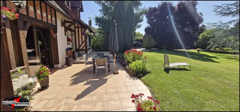 * a vendre seulement chez contact immobilier a 15 min du havre belle propriété d'environ 145 m² habitables dans un parc arboré de 2900 m² entièrement clos comprenant : une entrée, cuisine aménagée ouverte sur salon avec âtre, 3 belles chambres dont un au rez-de-chaussée, sdb thalasso, sdd sous-sol complet. Proche commerces / prestations haut de gamme / une visite s'impose.