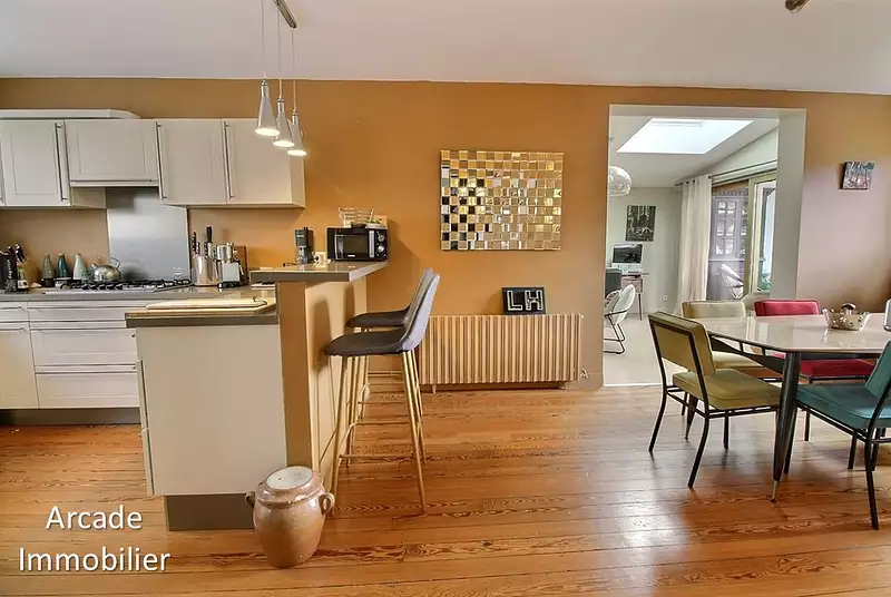 Grande maison familiale à 2 pas des commerces et des écoles. Séjour-salon avec cuisine aménagée ouverte 53 m2, accès terrasse, 4 chambres dont suite parentale avec salle de bains 25 m2, salle de bains, salle de douches. Garage. Parking pour 3 voitures. Jardin. Rare sur secteur convoité. Prestations de qualité.