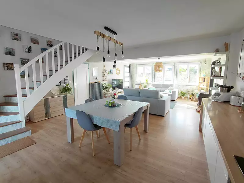 A VENDRE - MORLAIX : située en impasse à proximité immédiate de toutes les commodités, venez découvrir cette spacieuse et lumineuse maison rénovée avec beaucoup de goût. Elle dispose au rez-de-chaussée d'une vaste pièce de vie très chaleureuse avec une cuisine ouverte aménagée équipée, un cellier/buanderie. Au 1er étage se trouve une belle mezzanine, trois chambres, une salle de bains et un WC. Le dernier comprend un deuxième espace mezzanine et deux chambres. Joli jardin clos avec terrasse parfaitement exposée. Cabanon. (6.03 % honoraires TTC à la charge de l'acquéreur.)
