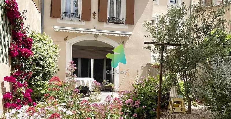 Narbonne, Secteur Mazagran, maison de ville avec cour et parking comprenant : rdc : hall - bureau 12.58 m2 - cuisine équipée 16 m2 séjour salon 33.69 m2 - wc - jardinet/cour de 100 m2 environ avec atelier 15.50 m2 et possibilité de rentrer 2 véhicules - 1er étage : 4 chambres dont 2 avec placards (13.57, 13.20, 14.67 et 11.10 m2) - salle d'eau - wc - grand pallier avec possibilité faire coin bureau - accès aux combles par un escalier escamotable - sh = 145 m2 environ - chauffage électrique - double vitrage - false