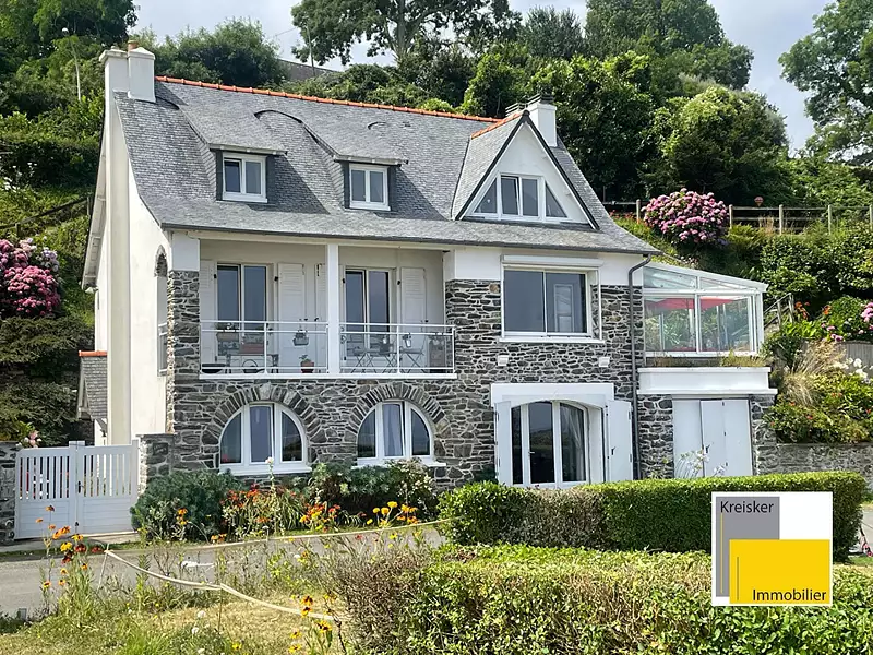 A vendre, en Bretagne, à PLESTIN LES GREVES, les pieds dans l'eau pour cette très belle maison en pierre rénovée offrant une vue panoramique sur la mer et disposant de 3 niveaux. Au rez-de-chaussée : entrée, deux chambres, pièce de vie avec cuisine aménagée équipée, salle de bain, w-c. A l'étage : entrée, salle à manger, salon, cuisine ouverte aménagée équipée, véranda face à la mer, pièce de vie avec accès au balcon, salle d'eau et w-c. Au 2ème étage, vous pourrez profiter d'un autre salon séjour avec cuisine aménagée équipée, d'une chambre et salle d'eau avec w-c. Garage. Jardin clos sans vis-à-vis. Très belles prestations ! (5.00 % honoraires TTC à la charge de l'acquéreur.)