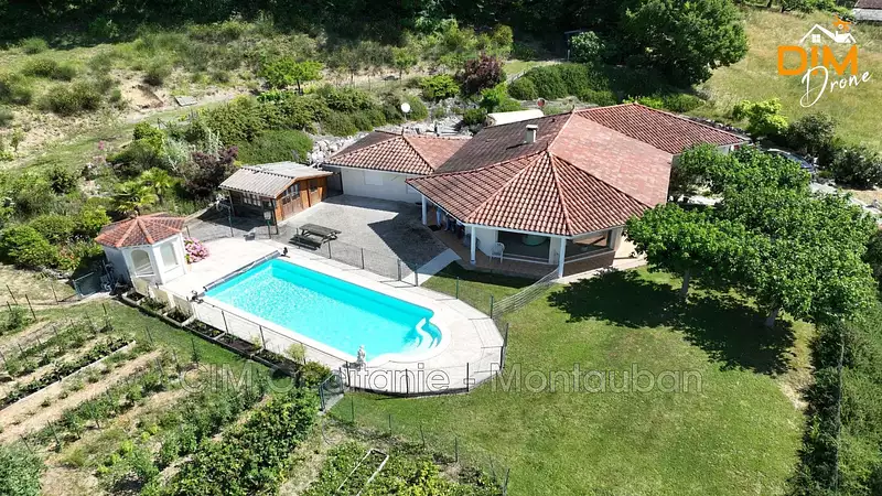 A VENDRE 10143. Secteur LAUZERTE, Vous serez charmés par cette splendide maison traditionnelle de 160 m² sur un terrain de 4 000 m². Cette maison est située sur les coteaux à moins de 5 kms du village classé de LAUZERTE. Offrant un cadre de vie pour les amoureux de la nature, vous trouverez à l'intérieur, un grand salon séjour de 66 m² très lumineux de forme panoramique avec 3 baies vitrées, une cuisine toute équipée et un cellier. Coté nuit, nous avons 4 belles chambres 10 à 13 m², une grande salle de bains de 12 m² avec sa baignoire d'angle à balnéothérapie et sa douche à l'italienne ajoute un confort indéniable, 2 wc. Pour son chauffage, elle est équipée de climatisation réversible et d'un poêle à bois. L'eau chaude est assurée par un cumulus électrique. Le plus de cette belle maison, un grand garage carrelé isolé, une grande terrasse couverte donnant sur une superbe vue de la campagne, une cuve enterré avec pompe pour récupérer les eaux de pluie et arroser le jardin, une piscine de 10 x 5 avec volet roulant électrique et une filtration sel. Nous trouvons aussi un chalet bois de 10m² servant d'atelier ou rangement, un accès a la maison avec un portail électrique Située au calme cette maison magnifiquement arboré dispose d'une vue imprenable sur le Quercy blanc.