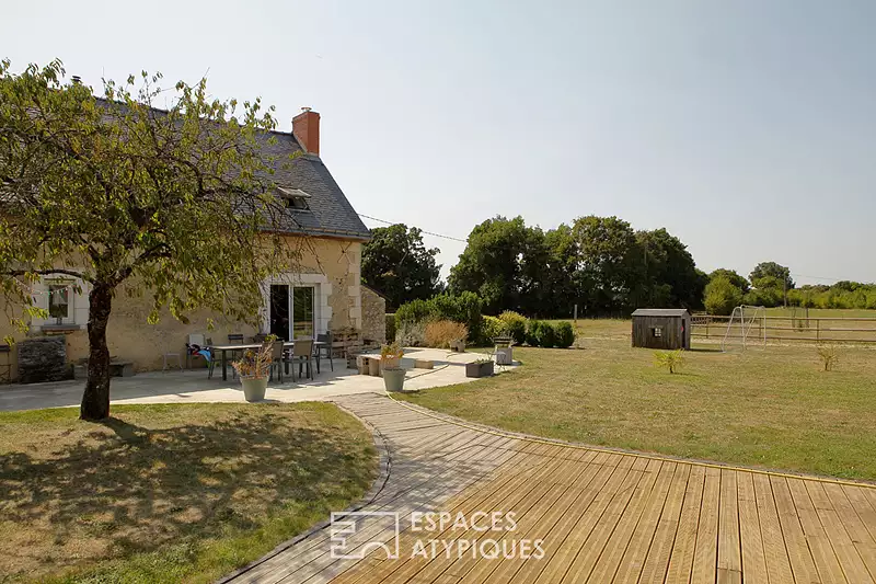 Nichée au coeur d'un écrin de verdure, cette superbe longère rénovée de 147 m² séduit immédiatement par l'authenticité de ses matériaux et l'atmosphère chaleureuse qui s'en dégage. Les poutres apparentes, les volumes bien pensés et le cadre paisible qu'elle offre en font une propriété rare, au potentiel indéniable. Édifiée sur un terrain arboré de 4 hectares, la maison principale propose une vie de famille agréable et fonctionnelle. Le rez-de-chaussée s'ouvre sur une entrée accueillante qui mène vers une cuisine aménagée et équipée, ouverte sur un vaste séjour baigné de lumière, comprenant un salon, une cheminée et un poêle à bois. Une grande chambre, un second salon avec cheminée majestueuse, une salle d'eau ainsi que des toilettes séparées complètent ce niveau, pensé pour un confort de vie au quotidien. A l'étage, trois chambres supplémentaires, un bureau, une seconde salle d'eau et des toilettes indépendants permettent d'envisager une vie familiale harmonieuse ou l'accueil d'invités dans les meilleures conditions. La propriété bénéficie également d'une belle dépendance d'environ 146 m². Véritable atout, elle accueille une grande pièce à aménager selon les envies, idéale pour des réceptions, des activités professionnelles ou un projet de gîte. L'étage de cette dépendance offre lui aussi de belles possibilités d'hébergement. Un grand hangar vient compléter l'ensemble. Il offre de multiples usages, qu'il s'agisse de stationnement, de stockage ou d'un futur aménagement. L'ensemble s'inscrit dans un environnement naturel préservé, propice à la quiétude, et dispose d'un système de chauffage au bois, renforçant encore son caractère authentique. A seulement cinq minutes en voiture du bourg de Baugé-en-Anjou et de ses commerces, cette longère bénéficie d'une situation stratégique : le péage de Longué-Jumelles, sur l'axe Saumur-Angers, est accessible en vingt-cinq minutes, la gare TGV d'Angers-Saint-Laud en quarante-cinq minutes, et celle du Mans en à peine plus d'une heure. CLASSE ÉNERGIE : D / CLASSE CLIMAT : B Montant moyen estimé des dépenses annuelles d'énergie pour un usage standard, établi à partir des prix de l'énergie sur les années 2021, 2022, 2023 : entre 2080 euros et 2870 euros. Contact : Eddy MICHEL 06 49 20 81 90 Agent commercial immatriculé au RSAC de ANGERS sous le numéro 504 206 582. Les honoraires sont à la charge du vendeur. Les informations sur les risques auxquels ce bien est exposé sont disponibles sur le site Géorisques pour les zones concernées: www.georisques.gouv.fr