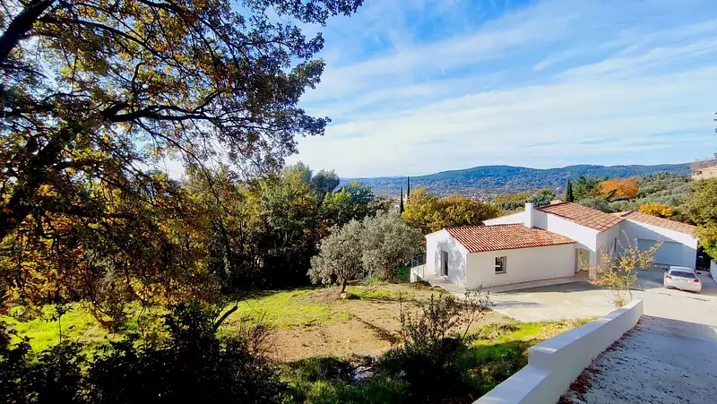 À Draguignan, sur les hauteurs, maison individuelle T5 de plain-pied entièrement rénovée, au calme, en position dominante. Grande terrasse exposée sud avec vue dégagée. Terrain arboré de 3 900 m² garantissant quiétude et intimité, sans vis-à-vis.