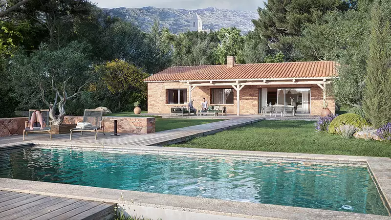 Conçue dans un esprit alliant tradition et modernité, cette maison de plain-pied reprend les codes architecturaux des bergeries corses, avec des matériaux nobles tels que la pierre naturelle et le travertin dans la pièce de vie et plancher bois dans les chambres, tout en offrant le confort moderne avec une belle hauteur sous plafond de 2,70m. Elle développera environ 150 m2 habitables sur un terrain arboré de 1 500 m2.
