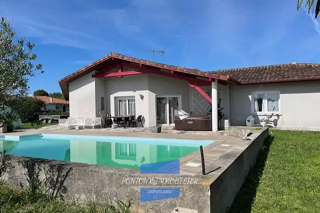 Gamarde, spacieuse villa de 98, plain-pied, de type F7 de 147 m2 habitables bien répartis, comprenant : Entrée avec placards, vaste pièce de vie de 40 m2 avec poêle à granules, cuisine aménagée et équipée de 20 m2 , cellier attenant, dégagement, 3 chambres avec placards, bureau, salle de bains complète, wc, + 1 autre bureau avec accès indépendant. Carport 2 voitures de 33 m2 attenant. Piscine traditionnelle 8/4. 2 terrasses couvertes. 1dépendance de 27 m2. Terrain clos de 1602 m2.