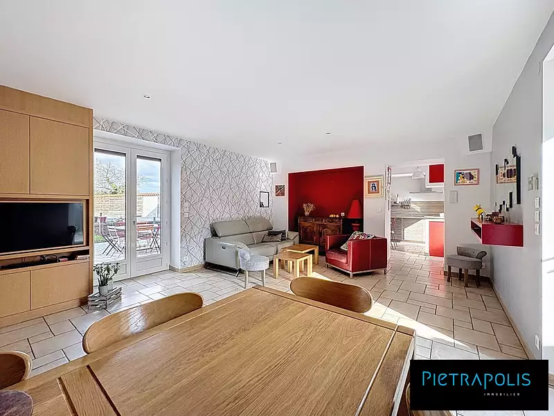 Le Rdc se compose : d'une pièce de vie traversante de 30 m² ouvrant sur les deux terrasses de chaque côté de la maison, d'une cuisine, d'une buanderie et de toilettes.