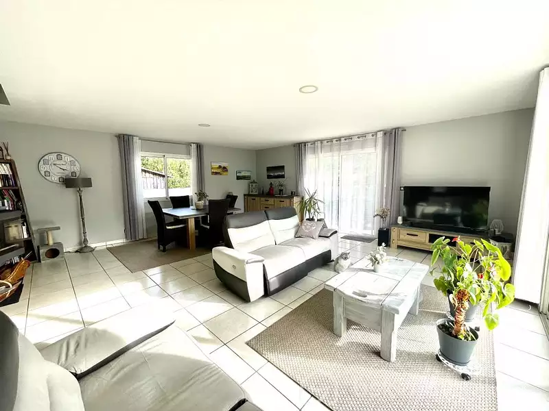 La maison elle-même est un modèle de fonctionnalité et de confort. Passez l'entrée une spacieuse pièce de vie de 50m² baignée de lumière s'offre à vous ainsi qu' une cuisine indépendante de 13m² aménagée et équipée bénéficiant d'un cellier de 8m²qui ajoute une touche de praticité indéniable, facilitant le rangement et l'organisation de vos provisions.